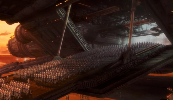 Da die Kanonenboote auf diese Weise den Hangarboden nicht berührten, blieb dort viel Spielraum für Transportbewegungen und nicht zuletzt die schweren Fahrzeuge, die entlang der Seitenwände in zwei Reihen von Abstellflächen - die insgesamt 48 gepanzerten Läufer wie AT-TEs hierbei jeweils vor den 36 SPHAs - untergebracht waren. Aufgrund der platzsparenden Abfertigung der Kanonenboote wurde der Spielraum, der den Läufern zum Manövrieren zur Verfügung stand, nur noch durch die in regelmäßigen Abständen platzierten Deckenpfeilern und einigen weiß markierten Versorgungsliften im Boden eingeschränkt. Die Unterbringung der AT-TEs in der vorderen Reihe bot überdies den Vorteil, dass diese im Falle des Einsatzes schnell in Bewegung gesetzt und von den Frachtkanonenbooten übernommen werden konnten. Für Fahrzeuge wie für Infanterie-Einheiten bot sich außerdem nach wie vor der Weg über die ausgefahrenen Rampen zum Verlassen des Acclamator-Klasse-Kreuzers.[20] Die Schiffe hatten zudem einen ventralen Hangar, durch welchen Sternjäger und Kanonenboote direkt in den Orbit einschwenken konnten.[1][21][9]