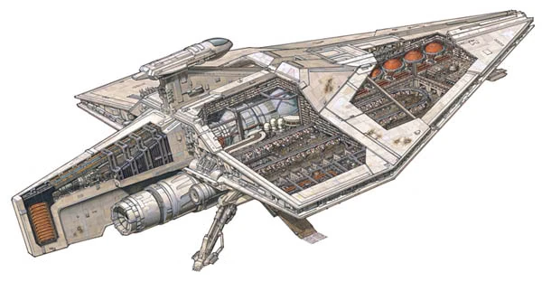 Oberhalb der Tanks im Vorderbereich lag eine weitere wichtige Sektion, die Logistikhangars in denen Anlieferungen und Abtransporte abgewickelt wurden. Beförderungswege führten von hier aus zu allen Teilen des Schiffes. Die Energiesysteme wiederum waren von einer Vielzahl von Räumen umgeben, die sich zwischen der zentralen Aussparung und der Schiffshülle drängten. Diese machten einen Großteil der bewohnbaren Räumlichkeiten aus und dienten jedem nur erdenklichen Zweck, vom Wohnbereich bis hin zur Versammlungshalle. Durchzogen wurden die mehr als fünfzehn Decks von mehreren Turbolift-Schächten. Unterhalb der Kernsysteme, im ausladenden Kielbereich, befanden sich schließlich die großen Rampen und Luken zum Ausschleusen und Aufnehmen von Kanonenbooten, Fahrzeugen und Infanterie.[20]