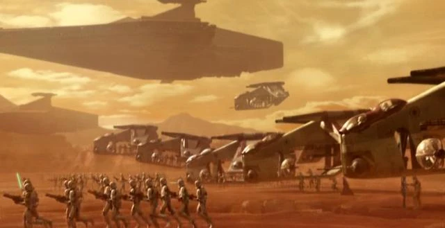 Die Angriffsschiffe der Acclamator-I-Klasse bzw. Transgalaktischen Militärtransporter der Acclamator-Klasse, auch einfach Acclamator, Republikanische Angriffsschiffe, RAS oder Jedi-Transporter[19] genannt, waren ein wichtiger Bestandteil der Flotte der Galaktischen Republik und von entscheidender Bedeutung für viele Landeoperationen der GAR. Ein jedes dieser Schiffe konnte eine Vielzahl Klonkrieger, zahlreiche TFAT/i-Kanonenboote sowie zusätzliche Bodeneinheiten befördern und auf Planetenoberflächen absetzen. Zudem waren sie mit ihrer schweren Bewaffnung in der Lage, Truppen aus der Luft zu unterstützen und sogar orbitale Bombardements durchzuführen. Ihnen kam damit eine Schlüsselrolle in der Zeit Klonkriege zu und sie waren damit bei vielen Schlachten präsent. Gegen Ende des Konfliktes wurden von ihrem Hersteller Rothana-Schwermaschinenbau, eine Tochtergesellschaft der Kuat-Triebwerkswerften, außerdem die Acclamator-II-Klasse produziert. Auch nach Ende des Krieges und der Auflösung der Republik blieb die Acclamator-Klasse in Gebrauch, wenn auch in imperialen Diensten.