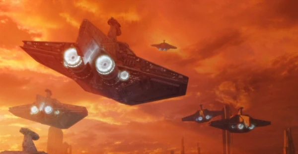 Acclamator-Klasse-Kreuzer heben von Coruscant ab