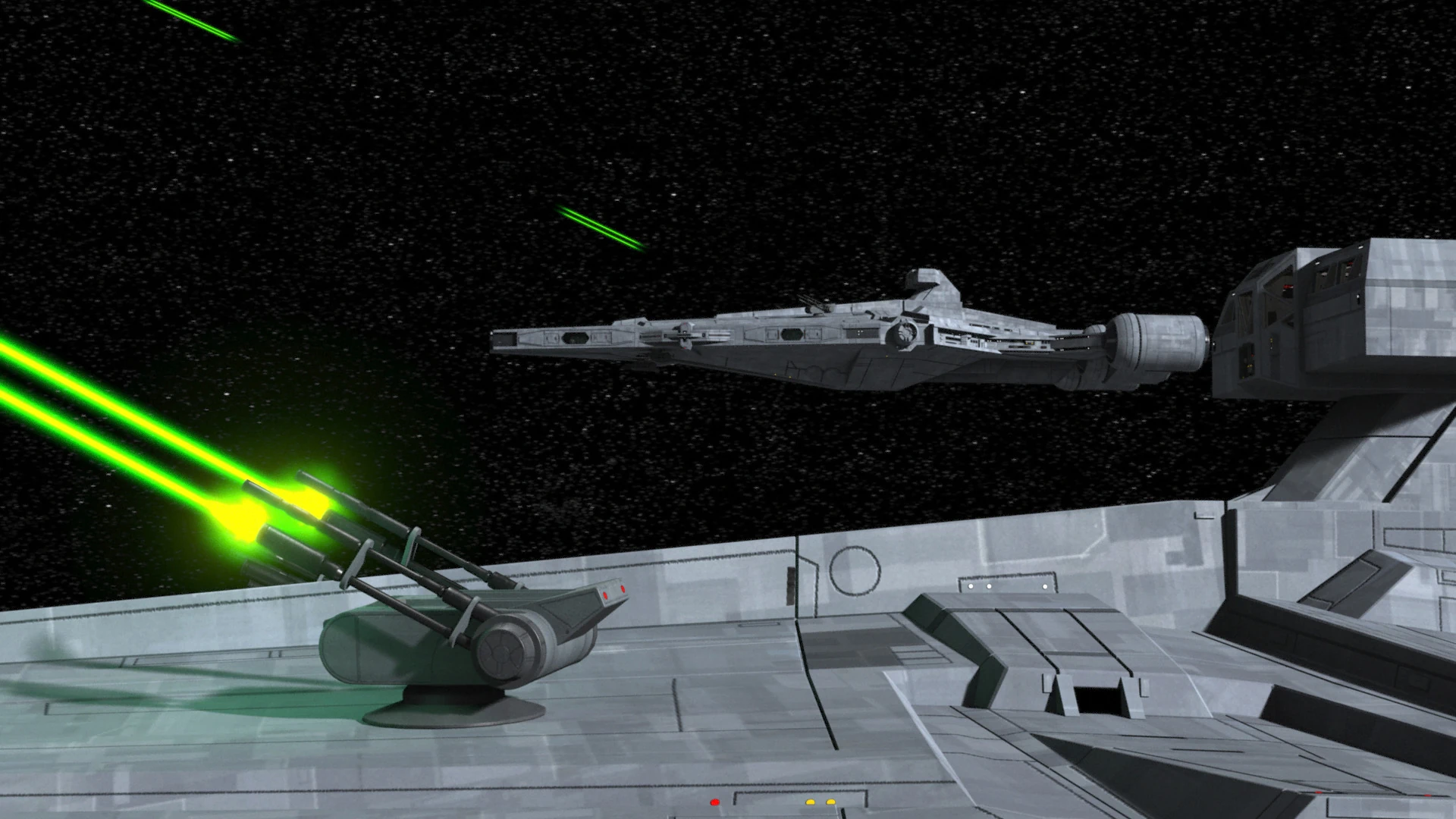 Etwas später versuchte ein leichter Kreuzer über Garel, die Broken Horn abzufangen, da diese unerlaubt einen imperialen Kontrollpunkt passiert hatte. Trotz Treffer der beiden obenen Vierlingsgeschütze konnte der Transporter in den Hyperraum fliehen.[48]
