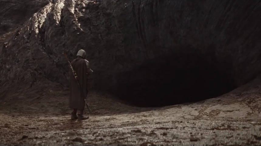 Din Djarin steht vor der Höhle des Schlammhorns.