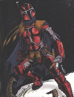 Mandalorianische Frau in typischer individualisierter Söldner-Rüstung.