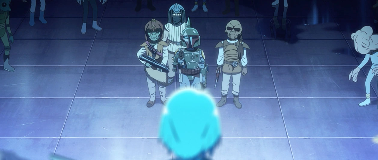 Boba Fett spricht mit den republikanischen Geiseln.