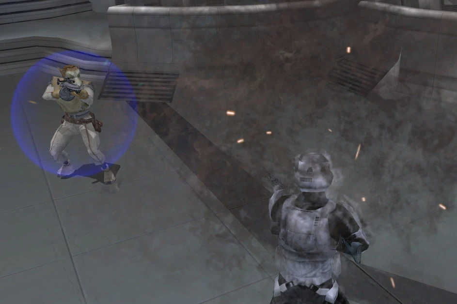 Ein Spion attackiert einen Sturmtruppler mit seinem Verbrenner.