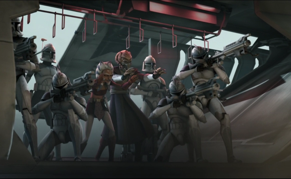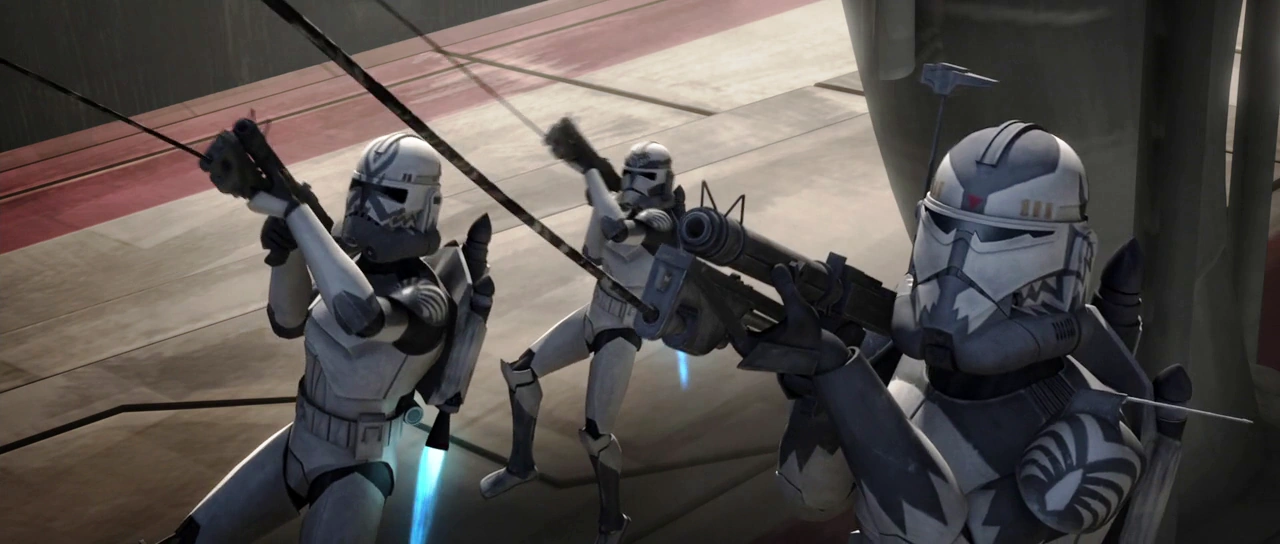 - „Ihr habt Commander Tano gehört. Ich brauche Männer oben mit Raketenrucksäcken und Seilwerfern. Bewegt Euch!“