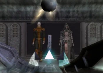 — Malak zweifelt ein letztes Mal (Quelle)Unbehelligt vom Jedi-Orden kehrten Meister und Schüler schließlich nach Dantooine zurück, um die dortigen von der Dunklen Seite umgebenen Ruinen näher zu erforschen. In deren Inneren entdeckten sie eine alte Sternenkarte des bereits vor Jahrtausenden untergegangen Unendlichen Reiches der Rakata, die ihnen erste Hinweise auf die Koordinaten der Raumstation lieferte. Bevor sie jedoch diesen Schritt machten, hinterfragte Malak ein letztes Mal die Motive seines Meisters und wies ihn darauf hin, dass es dann kein Zurück mehr geben, sie aus dem Jedi-Orden ausgeschlossen werden würden. Revan ignorierte die Zweifel seines Schülers jedoch, öffnete die Tür und sie traten gemeinsam vor die Sternenkarte, da für den Jedi inzwischen andere Prioritäten galten – ob diese jedoch in der Loyalität gegenüber dem Sith-Imperator lagen oder er eigene Ziele verfolgte, die er vor Malak und dem Imperator geheim hielt, lässt sich nach Aussage der Historiker nicht abschließend feststellen.[15]