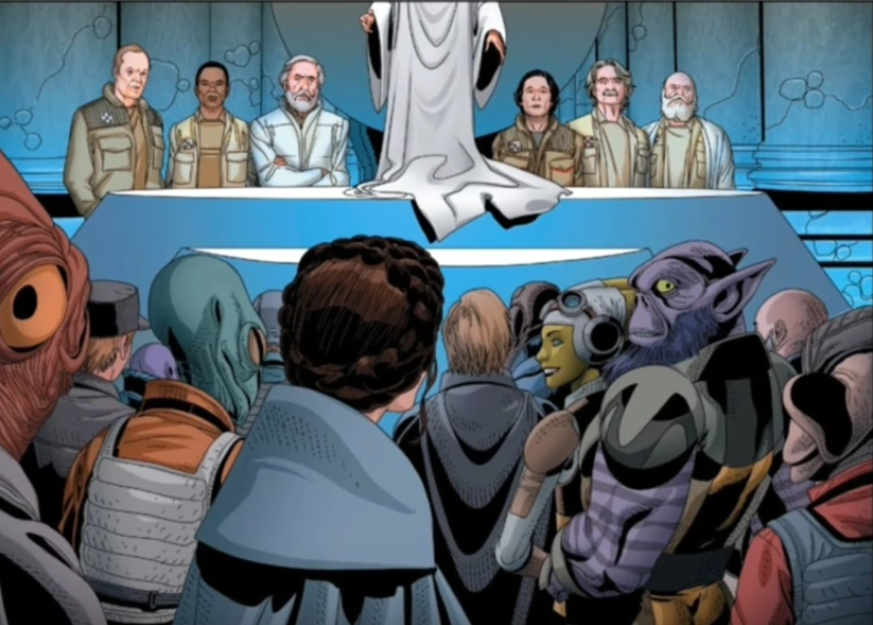 Als Reaktion auf die Gewissheit um die Gefahr durch den Todesstern trat auf Yavin IV der Rebellenrat zusammen. Dabei plädierten einige Kabinettsmitglieder, allen voran Tynnra Pamlo und Vasp Vaspar dafür, die Allianz aufzulösen, und zu kapitulieren, da einer solchen Waffe nichts entgegenzusetzen sei, während andere wie Admiral Raddus oder auch General Draven dafür waren, dass die Allianz gerade jetzt im Angesicht einer solchen Bedrohung unbedingt handeln müsse. Dabei griff Nower Jebel auch Draven persönlich an, der seine Entscheidung, die imperiale Basis auf Eadu zu vernichten aber als dringend notwendig verteidigte. Jyn Erso selbst unterstützte einen großflächigen Angriff auf Scarif, wo die Todessternpläne lagerten, und bat die Allianz ihre besten Truppen, wenn nicht sogar die Flotte der Rebellenallianz zu schicken, was vor allem bei Admiral Raddus auf Unterstützung traf. Nower Jebel zweifelte aber an der Glaubwürdigkeit von Galen Ersos Aussage. Da der Rat nun keine einstimmige Lösung finden konnte, war die Allianz zum Nichtstun verdammt.[1]