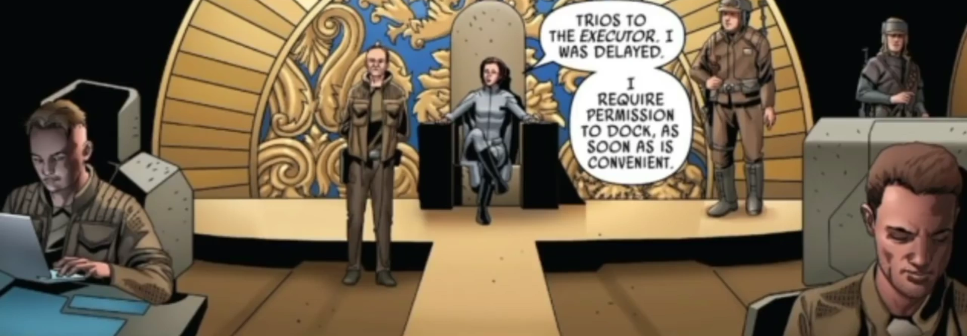 - Leia Organa: „Schicken Sie ein Sicherheitsteam zu Trios' Schiff. Schanppt sie! Es muss eine Überbrückung geben!“