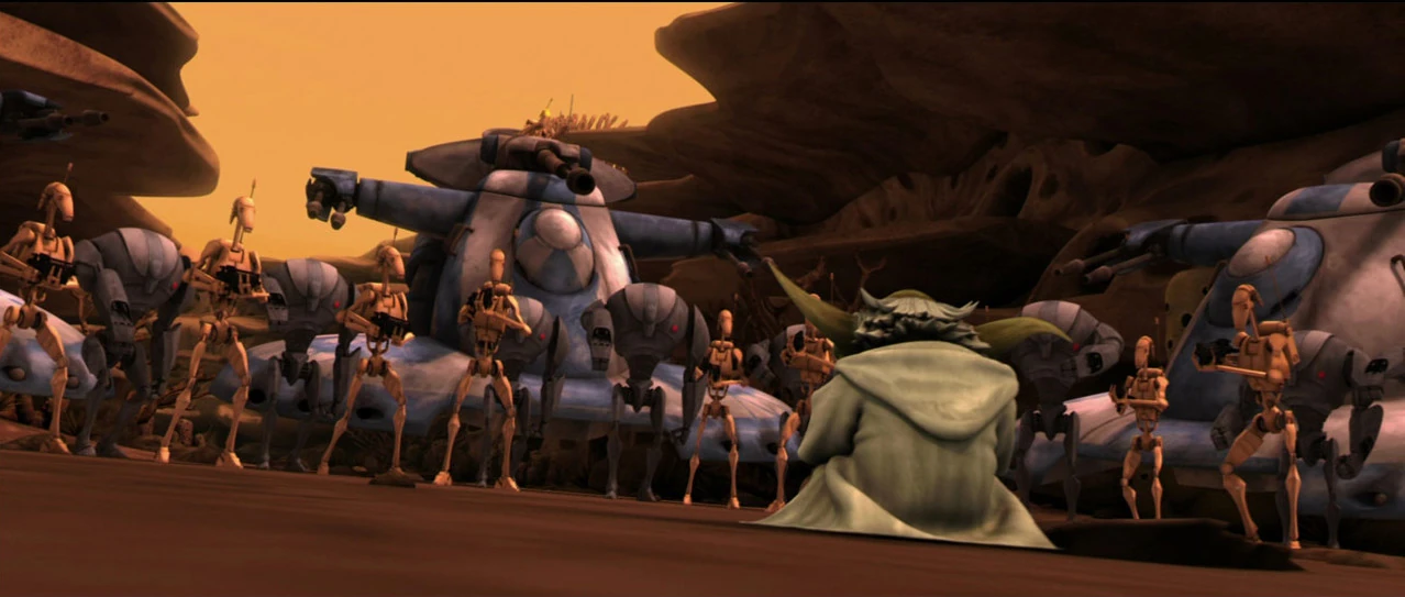 Die Klonkrieger und Yoda gehen aus der Höhle und beobachten AATs, B1-Kampfdroiden und B2-Superkampfdroiden, die sich durch eine Schlucht bewegen. Yoda befiehlt den Klonkriegern, auf sein Zeichen zu warten, während er selber hinunter springt und sich vor den Droiden auf den Boden setzt. Während sie dem Jedi den Fluchtweg abschneiden, bereiten sie sich auf das Schießen vor.