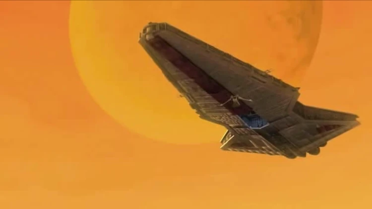 Ein Venator-Klasse-Sternzerstörer in der Atmosphäre Rugosas