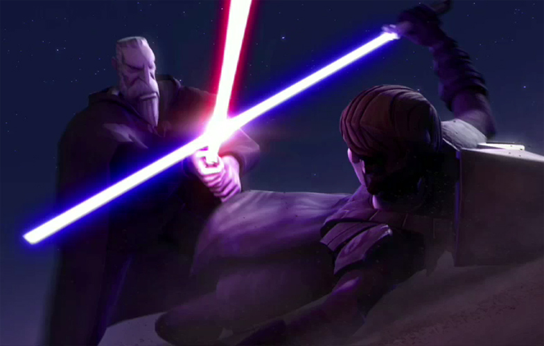Dooku hat Tholme im Lichtschwertkampf besiegt.