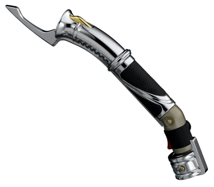 Die Form von Dookus Lichtschwert ist mit dem gebogenen Heft in den Filmen einzigartig. Die Idee zu einem solchen Design entsprang experimentellen Entwürfen zu verschiedenen Sith-Charakteren. Roel Robles vom Art Department ließ sich dabei in erster Linie von philippinischen Hieb- und Stichwaffen wie Schwerter, Messer und Speere inspirieren. Auffällig ist die Ähnlichkeit zum Schwert-Typ Barong, der ebenfalls einen gebogenen Griff besitzt.[49] Innerhalb des Star-Wars-Universums ist jedoch strittig, wann genau Dooku zu einer solchen Form des Lichtschwerts griff. Während auf dem Cover zum Roman Das Vermächtnis der Jedi Dooku mit seinem gebogenen Schwert in seiner Zeit als Padawan zu sehen ist, schreiben sowohl Offizielle Star Wars Fact File als auch Jedi vs. Sith – The Essential Guide to the Force, dass Dooku als Padawan ein konventionelles Schwert besaß und nach seinem Austritt aus dem Jedi-Orden jene Waffe konstruierte, die auch in den Filmen zu sehen ist.