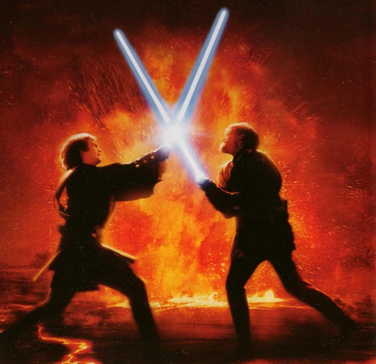 Beide kämpften unerbittlich weiter: Obi-Wan auf der Felsformation, Vader auf dem Droiden. Mit einem Vorwärtssalto katapultierte Vader sich hinter seinen ehemaligen Meister. Auf engstem Raum versuchten beide ihren Kontrahenten in die Lava zu stoßen, was jedoch keinem gelang. Obi-Wan schaffte es, sich aus der Schlagfolge zu lösen und an das nahe gelegene Ufer des Lavastroms zu springen. Von seinem tiefen Hass und Zorn geblendet, ignorierte Vader die Forderung Obi-Wans, nicht zu springen, da er den Sprung nicht überleben würde. Noch in der Luft trennte Obi-Wan Vaders Beine von seinem Oberkörper. Der schwer verstümmelte Vader fand daraufhin keinen Halt und stürzte den Abhang hinunter, in Richtung der kochenden Lava. Obi-Wan redete noch ein letztes Mal auf Vader ein und zeigte seine tiefe Trauer über den Verlust seines Schülers, der für ihn wie ein Bruder gewesen sei. Danach steckte er dessen Lichtschwert ein und verließ Mustafar, während Vader unter grausamen Qualen verbrannte.[1]