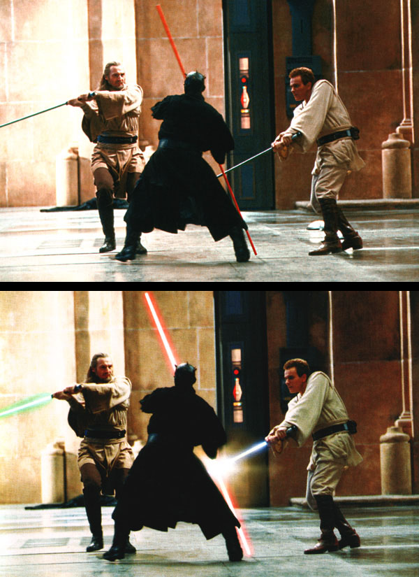 Dieser fatale Fehler soll ihm jedoch das Leben kosten, denn Obi-Wan Kenobi schafft es mit Hilfe der Macht wieder auf die Plattform zu kommen und Qui-Gons in der Nähe liegendes Lichtschwert zu greifen. Bevor der überraschte Darth Maul reagieren kann, wird er von dem Jedi in zwei Hälften geschlagen und stürzt vermeintlich tot in den Reaktorschacht. Direkt nach seinem Sieg stürzt Obi-Wan zu seinem sterbenden Meister. Qui-Gon glaubt bis zu seinem Tod, dass Anakin der Auserwählte ist, deshalb verspricht Kenobi seinem Meister, Anakin auszubilden.