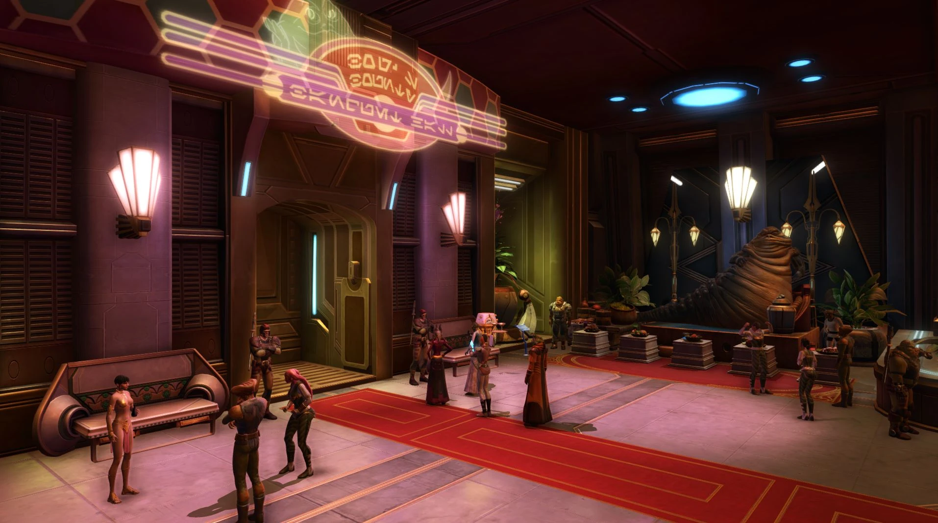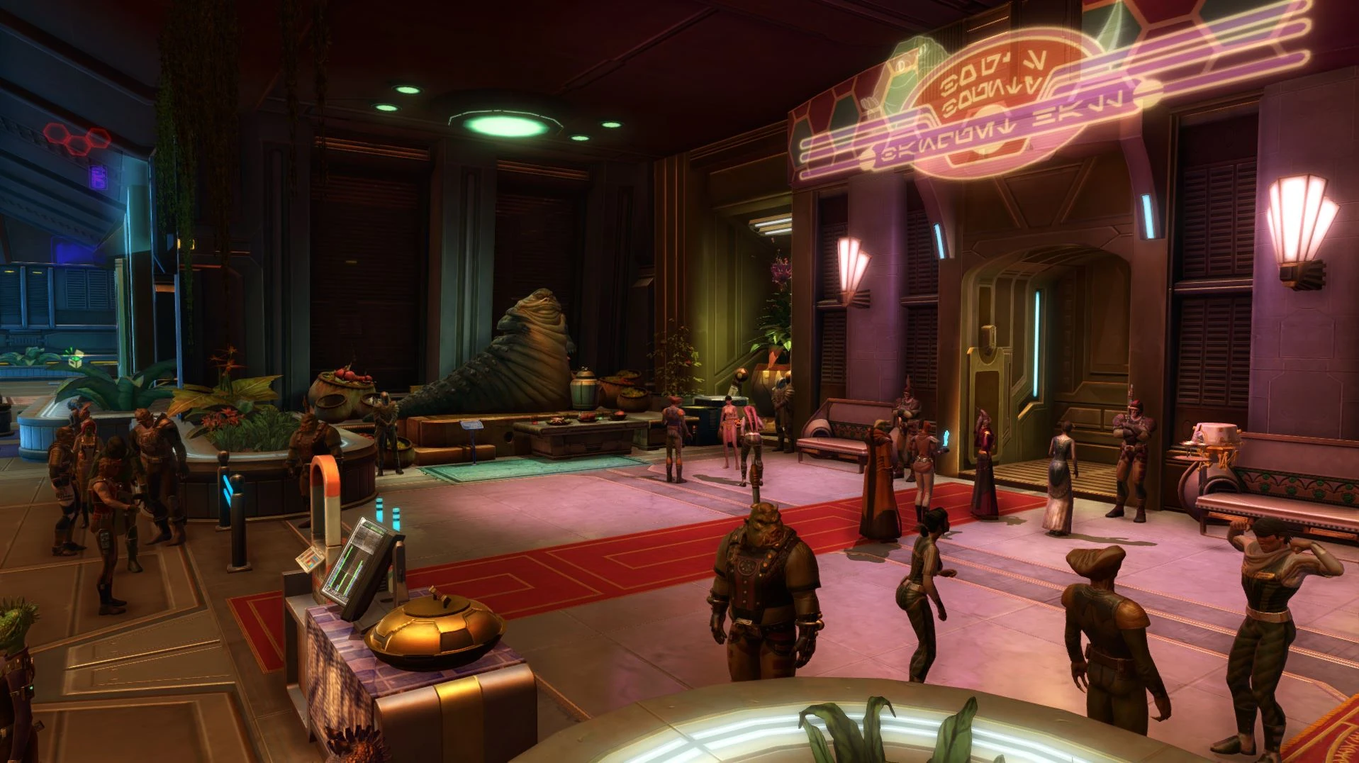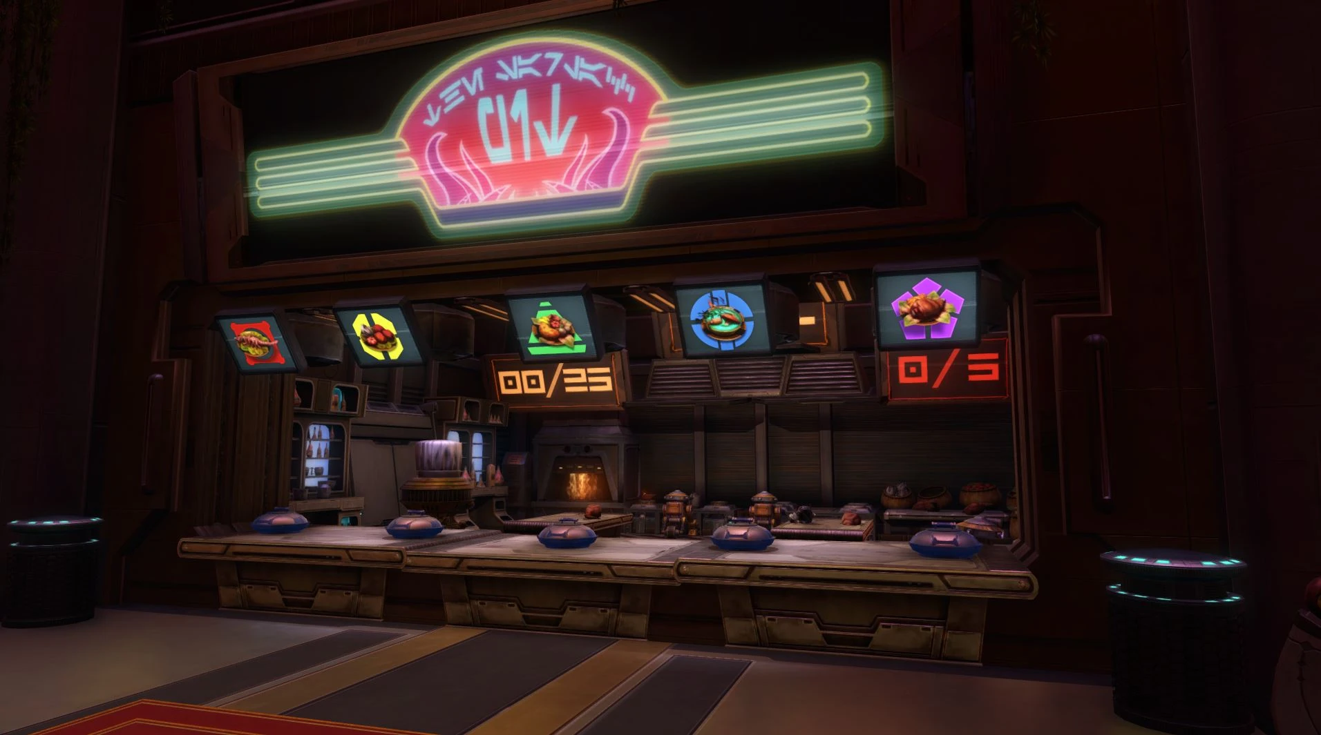 Um dem großen Andrang nach Nahrung gerecht werden zu können, wurde ein automatisiertes Cantina-System von Fez Burba gekauft. Allerdings stellte sich das System als unvollständig heraus und die Droiden waren zu langsam bei der Bewirtung.[25] Der Fremdling steuerte deshalb zur Bewirtung einen Dienerdroiden während der Mittagszeit[26] und während der Abendzeit mit ihren vier Gängen im Sumpfschatz-Bankettsaal fern. Zu Essen gab es honigglasierte K'lor-Schnecke, Sumpflinsensuppe, gebratenen Schlickbrummer, eine üppige huttische Frühstücksplatte und eine vegetarische Kombination.[27]