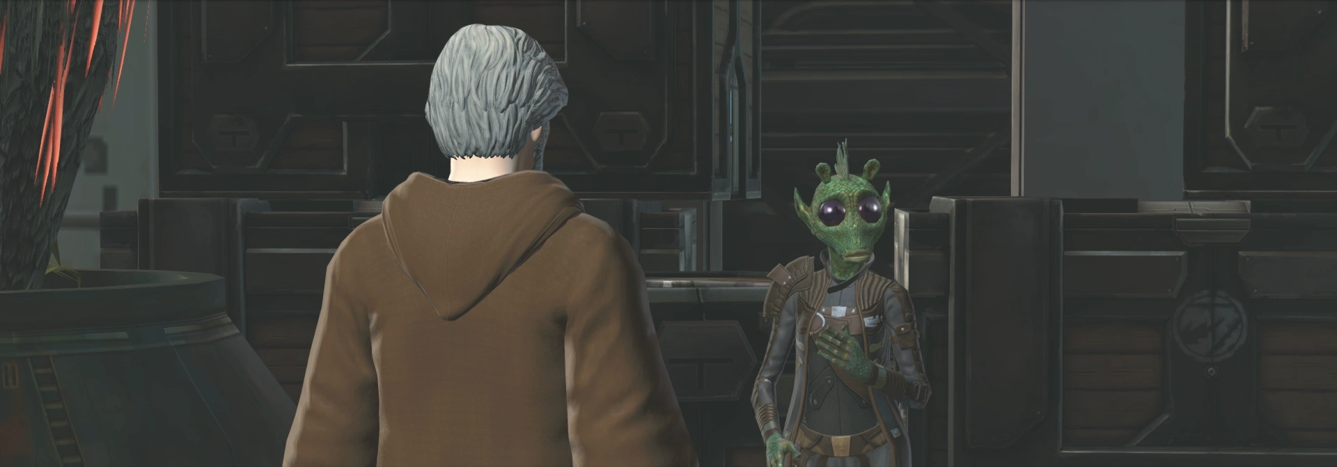 Der Fremdling reiste zum Tauntaun-Steakhaus im Bleiregen-Hafen, dem letzten bekannten Aufenthaltsort von Yendo. Dort traf er auf einen Rodianer, der den Unwissenden spielte und verängstigt wirkte, als sich nach Yendo erkundigt wurde. Dann gab er preis, dass die Nautolanerin sich vor irgendwas auf Mek-Sha versteckte, jedoch seien eines Abends Söldner gekommen und hätten sie abgeholt. Diese wollten sie an die Brüder verkaufen. Der Fremdling brach deshalb zur Roten Zone auf und fand Nuura Yendo schließlich in der Nähe der Schrottgrube.[29]