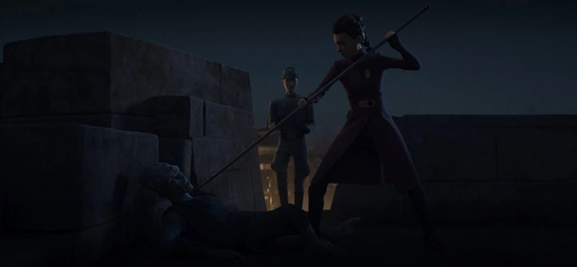 Die Magistratin reagierte mit Verwunderung, woraufhin Pellaeon erklärte, dass sein Vorgesetzter ihn gezielt zu Besprechungen wie dieser schickte, um Personen mit außergewöhnlicher Weitsicht ausfindig zu machen. Er fragte die Nachtschwester von Dathomir jedoch zunächst, wieso sie ihre Talente in den Dienst des Imperiums stellen wolle. Elsbeth zögerte zunächst und log, dass sie dies zum Ruhme des Imperiums täte. Der Captain zeigte Verständnis für ihre Antwort und verließ den Konferenzraum. Nach Elsbeths Rückkehr in die Stadt Calodan wurde sie des Nachts von den Noghri-Attentäter Rukh auf der Stadtmauer angegriffen, um ihre Kampfkünste zu testen. Die Nachtschwester konnte sich mit ihrer Beskar-Lanze behaupten, wurde allerdings von dem imperialen Offizier gestoppt, ehe sie Rukh ernsthaft verletzen konnte.[3]