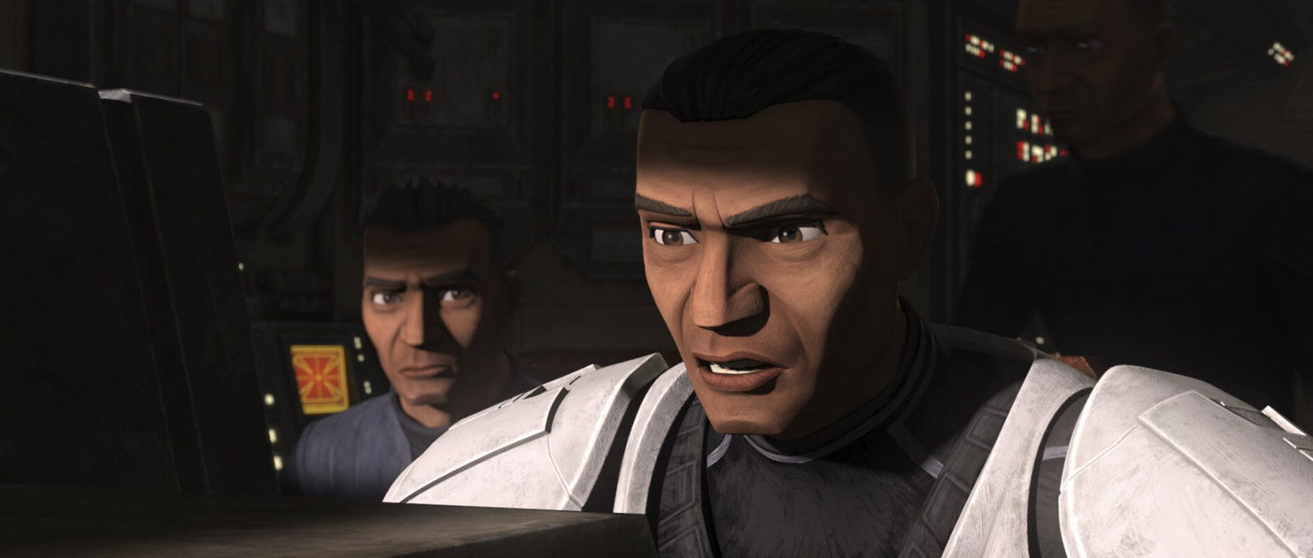 - R2-D2 scannt sein Handgelenk, doch normale Klonkrieger, sogar die Republik-Kommandos, hatten im Legends-Kanon niemals einen solchen Identifizierungscode. Die „Erkennungsmarke“ war meist ein Teil der Rüstung. Deshalb waren auch verdeckte Missionen wie der Anti-Terror-Einsatz auf Coruscant möglich, bei dem sich Captain Ordo für den Klonsoldaten Corr ausgab.