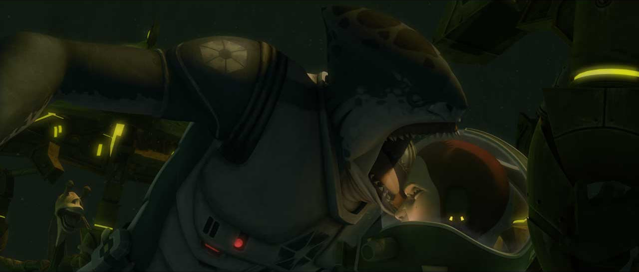 Sie wurden in ein separaten Raum gebracht, wo Riff Tamson bereits auf sie wartete. Dieser ließ Jar Jar und Padmé von den Jedi trennen und durch mechanische Greifarme fesseln. Anakin und Kit bekamen ihre eigene Foltermethode, indem sie jeweils in ein Karree aus Dac-Aalen gesteckt wurden. Tamson wollte von den Jedi wissen, wo sich Lee-Char versteckt hielt, als diese jedoch schwiegen, musste Jar Jar mit ansehen, wie die Aale mit Piken gestochen wurden, woraufhin sie elektrische Ladungen abgaben und diese durch die Jedi leiteten. Doch trotz der Schmerzen wehrten sie sich, zumal sie alle den genauen Aufenthaltsort des Prinzen nicht kannten. Daher wandte Tamson härtere Methoden als Elektroschocks an und attackierte zum Entsetzen von Jar Jar Padmé. Der Karkarodon biss ein kleines Loch in ihren Helm, durch das mehr Wasser einlief, als die Pumpen so schnell aufsaugen konnten. Nun lief ihnen die Zeit davon, denn lange würde der Helm das Wasser nicht zurückhalten. Da die Jedi trotz der lebensbedrohlichen Lage der Senatorin nicht redeten, war Tamson schließlich überzeugt, dass sie nichts über Lee-Chars Verbleib wussten. In dem Moment meldete sich eine Aquadroiden-Patrouille bei dem Separatisten und berichtete, dass sie den Prinzen mit Ahsoka Tano aufgespürt und verhaftet hatte. Lee-Char hatte gefordert, mit Tamson zu sprechen, was dieser gerne annahm. Anakin rief dem sich zum Gehen wendenden Tamson zu, er müsse Padmé befreien, doch dieser lachte nur verächtlich und schwamm davon. Nun waren die vier zwar immer noch gefangen, aber wenigstens nicht mehr bewacht, und Jar Jar meinte, er hätte eine Idee. Doch Anakin unterbrach ihn und schaffte Padmé gemeinsam mit Kit eine Blase durch die Macht, die das Wasser wegdrückte. Erst glaubte Jar Jar, es würde funktionieren, doch dann wurden die Jedi wieder durch eine Schockwelle unterbrochen und das Wasser drohte, wieder in Padmés Helm zu schwappen. Daher setzte Jar Jar seine Idee nun ohne Zustimmung um und spuckte eine wasserdichte Blase auf das Leck, das er so versiegelte. Der Gungan erklärte, dass diese Wasserdichtung der Grund sei, warum sie so gut schwimmen konnten. Zwar konnte Padmé nun fast nichts mehr sehen, doch wenigstens war die Gefahr gebannt.[11]