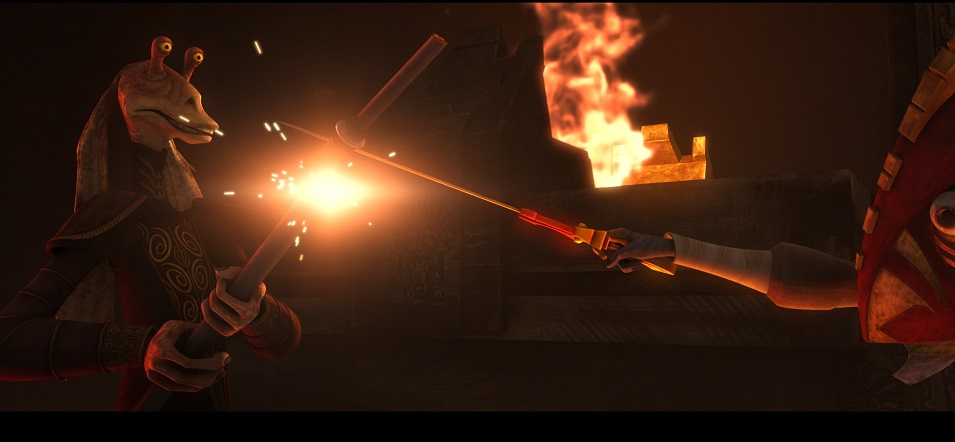Padmé konnte zuvor jedoch noch Notruf absetzen, sodass Anakin Skywalker mit einer Gruppe Klonkrieger eine Befreiungsaktion startete. Bei dem Versuch, die Basis zu verlassen, ließ einer von Vindis Droiden eine Blauschattenbombe explodieren, was die gesamte Anlage kontaminierte. Jar Jar schaffte es rechtzeitig, einen Schutzanzug anzulegen und veruschte zusammen mit Padmé, Ahsoka und einigen Klonkriegern zu verhindern, dass die übriggebliebenen Kampfdroiden die Basis verließen und das Virus so aus dem Labor an die Oberfläche dringen konnte. Versehentlich beschädigte er dabei Padmés Schutzanzug, was sie auch dem Blauschattenvirus aussetzte, doch glücklicherweise konnten Anakin und Obi-Wan noch rechtzeitig ein Heilmittel vom Planeten Iego beschaffen und die Kontaminierten heilen.[9]