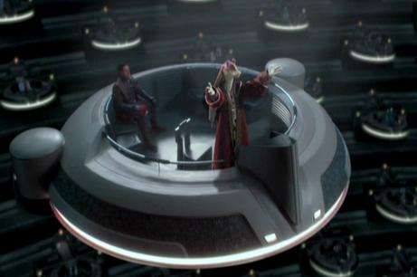 Als die Klonkriege 19 VSY zu Ende gingen, wurde Padmé Amidala schwanger. Was niemand wissen durfte, war, dass Anakin Skywalker der Vater war. Da dieser ein Jedi-Ritter war und ihm so eine Beziehung durch seinen Kodex verboten war, durfte Padmés Schwangerschaft nicht aufgedeckt werden.[13] Als die Konföderation unter GeneralGrievous' Kommando einen Angriff auf Coruscant startete, gelang es dem Cyborg, Kanzler Palpatine zu entführen und auf sein Flaggschiff zu bringen. Daraufhin führte Anakin Skywalker mit seinem Meister Obi-Wan Kenobi eine Rettungsaktion an, die damit endete, das Palpatine gerettet, Count Dooku von Anakin getötet und die Flotte der Separatisten vertrieben wurde. Jar Jar war einer der Senatoren, die den Kanzler und seine beiden Retter im Vorstandsgebäude empfingen.[13]