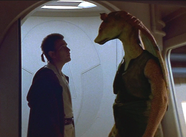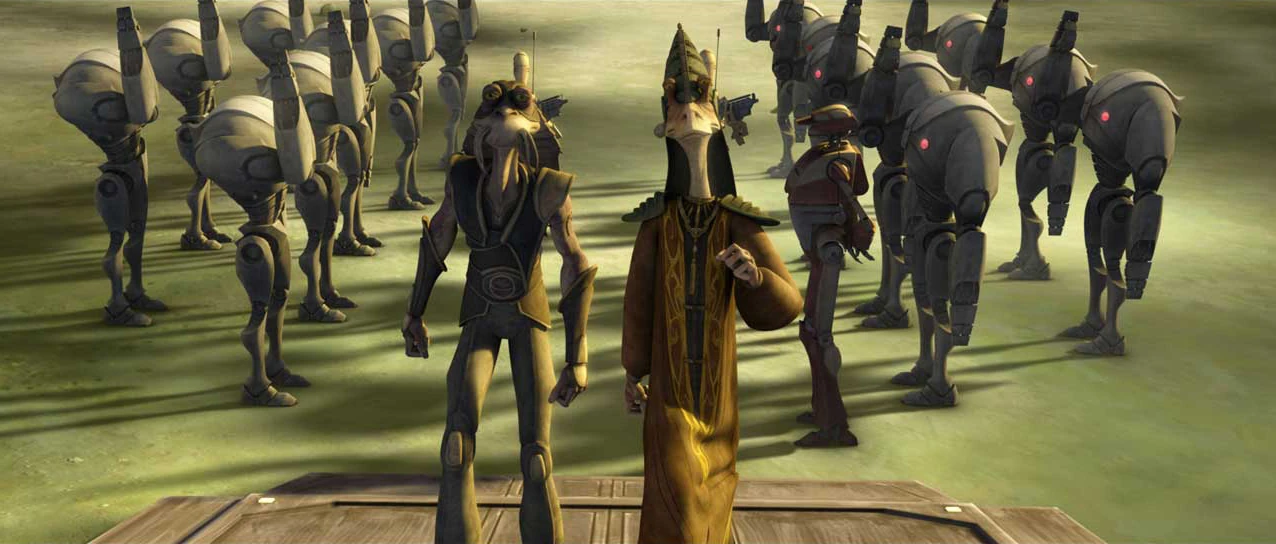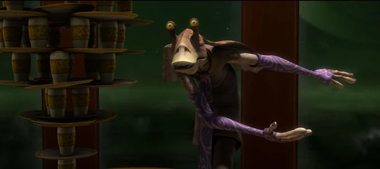 Jar Jar Binks war ein besonders tollpatschiger Gungan und war während der Ära der KlonkriegeAbgeordneter im Galaktischen Senat. Als über Jar Jars Heimatplaneten eine Blockade von der Handelsföderation errichtet wurde, schaltete sich die Republik ein, indem sie die JediQui-Gon Jinn und Obi-Wan Kenobi entsendete, um eine Einigung zu erlangen. Da die Föderation jedoch einen Krieg beabsichtigte, mussten sie auf den Planeten fliehen, wo sie auf Jar Jar trafen. Dieser half ihnen, das Volk der Naboo und die unter Wasser lebenden Gungans zu vereinen, damit sie gemeinsam gegen den Feind vorgingen. Er wurde zum General der Gungan-Armee ernannt, die die Streitkräfte der Föderation ablenken sollte, während eine Gruppe der Naboo den Palast der Hauptstadt Theed einnahmen. Dies gelang, sodass der Anführer der Handelsföderation, Nute Gunray, gefangengenommen und Naboo befreit werden konnte.