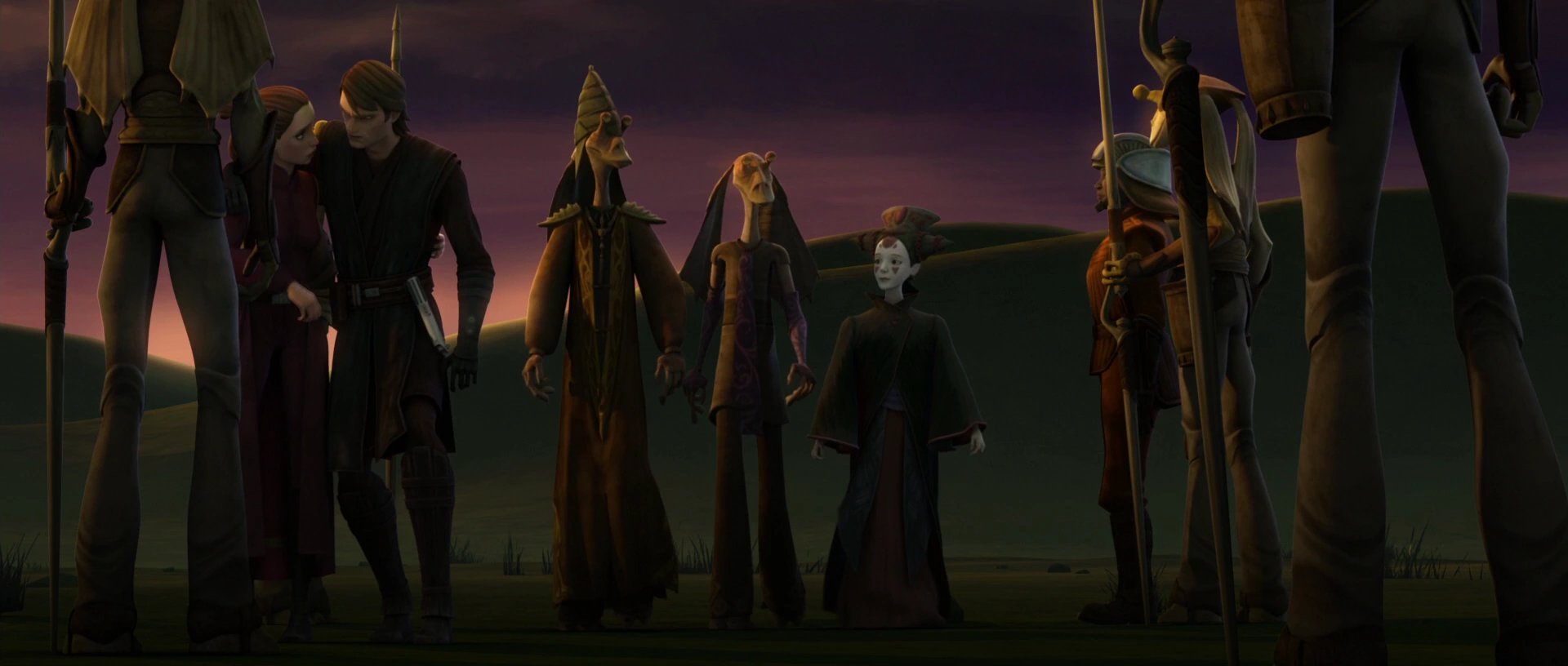 Daher begaben sie sich kurz darauf zu einer weiten Grasfläche, bei der die Separatisten-Streitkräfte bereit machten, den Planeten zu verlassen. Ein einzelnes Shuttle landete vor Padmé, Jar Jar, Königin Neeyutnee von Naboo sowie einer Wacheskorte und ein T-Serie Taktikdroide, eskortiert von vier Kampfdroiden, trat heraus. In ihrer Mitte schleiften sie den geschundenen Anakin mit sich, und der Taktikdroide forderte die Freilassung von Grievous. Neeyutnee gab ein Zeichen und einige Gungansoldaten trieben den durch Energiefelder gefesselten General zu den Droiden. Daraufhin warfen die Kampfdroiden Anakin zu seinen Kameraden und kehrten zum Shuttle zurück, das die Streitkräfte zum Rückzug führte. Während Anankin zur Versorgung weggebracht wurde, bedankte sich Lyonie bei Jar Jar, dass er erneut geholfen hatte, einen Krieg zwischen Gungan und Naboo zu verhindern. Auch Neeyutnee bedankte sich, doch Jar Jar erwiderte, dass er nur sein Bestes tun würde. Jetzt, da die Separatisten vom Planeten verschwunden waren, konnten sie gemeinsam nach Otho Gunga zurückkehren, um sich zu erholen.[12]