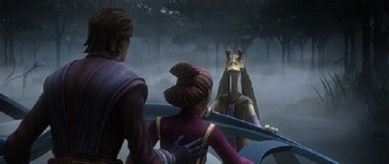 Anakin: „Jar Jar, kannst du mich hören? Hier ist Anakin. Wir müssen uns sofort an der Oberfläche des Lake Paonga treffen.“