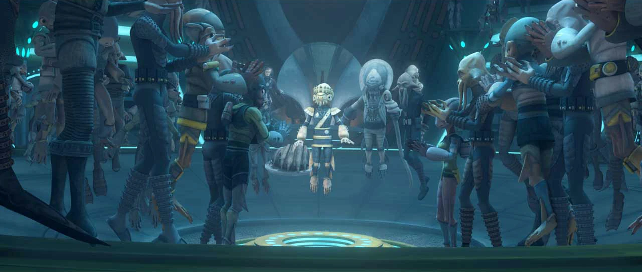 Als schließlich alle versammelt waren, begann Senator Organa, das darzulegen, was die Operation erwirken sollte, nämlich die lebensnotwendigen Lieferungen von Nahrung und Medizin nach Ryloth. Zudem ließ er ein Hologramm von Orn Free Taa, dem Senator von Ryloth, abspielen, der Katuunko und seinen Ministern das Leid der Twi'leks darlegte. Dennoch waren die Minister gespalten, da die Toydarianer zwar helfen wollten, sich aber auch nicht in den Krieg hineinziehen lassen wollten. Jar Jar verfolgte das alles schweigend, wie Bail es ihm gesagt hatte. Katuunko übergab schließlich Lott Dod das Wort, der schilderte, wie die Kämpfe auf Ryloth tobten und somit bewieß, dass Toydaria ein militärischer Stützpunkt werden würde. Dies hätte zu Folge, dass die Separatisten sich gegen den Planeten und die Frachtschiffe der Handelsföderation wenden würden, was diese zwingen würde, den Handel einzustellen. Diese Argumente wirkten auf die Minister fast schlagend, weshalb Bail noch einen letzten Versuch unternahm. Er gab zu bedenken, dass die Twi'leks nicht um die Invasion ihres Heimatplaneten gebeten hatten und nicht auch noch für ihre Lage bestraft werden sollten, wenn die Hilfe ausblieb. Katuunko dankte Jar Jar, Bail und Dod für ihre Reden und entließ sie, damit er sich mit seinen Ministern beraten konnte.[10]