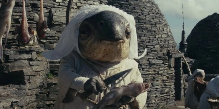 - Luke Skywalker: „Das ist ein Stamm von einer Nachbarinsel. Einmal im Monat kommen sie her, um das Dorf der Hüterinnen zu überfallen, zu plündern und zu brandschatzen.“
