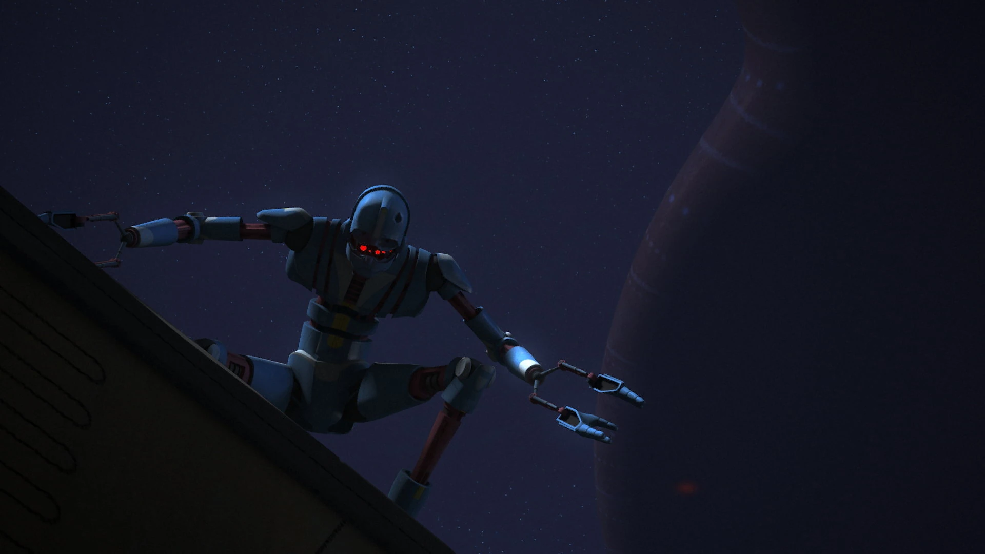 | Ezra beschließt, sich Heras Befehl zu widersetzen und mit den Anderen nach Kanan zu suchen. Er bittet Vizago um Hilfe und bekommt den Hinweis, dass das Imperium mittlerweile Droiden-Kuriere entsendet, da der Hauptsendeturm zerstört wurde. Weil diese Droiden an alle Informationen kommen, tauschen sie heimlich einen Droiden-Kurier gegen Chopper aus. So erfahren sie Kanans Aufenthaltsort und können einen Plan schmieden, um ihn zu befreien.[17] | ||||||