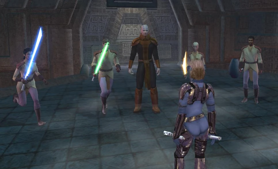 - Es besteht auch die Möglichkeit, das Spiel mit einem männlichen Hauptcharakter zu spielen, jedoch gilt es mittlerweile als kanonisch, dass die Verbannte weiblich war. Im Falle eines männlichen Verbannten schließt sich Brianna der Gruppe an, die anschließend von ihm zum Jedi ausgebildet werden kann – anstelle des Jüngers Mical, der sich der weiblichen Meetra Surik anschließt. Später wurde von offizieller Seite bestätigt, dass sich beide Meetra anschließen würden.[2]