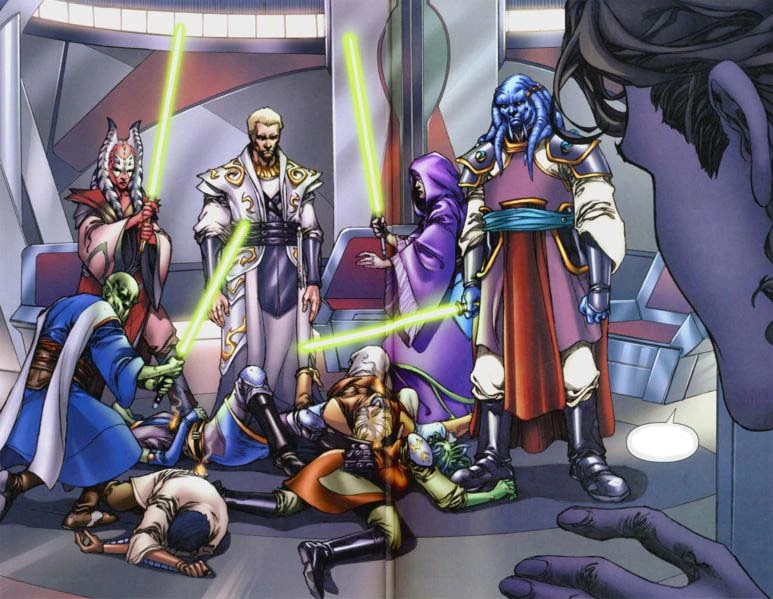 Während eines Banketts, bei welchem die Padawane zu Rittern geschlagen werden sollten, töteten die Meister schließlich alle ihre Padawane, mit Ausnahme von Zayne Carrick. Einer der Padawane, Shad Jelavan, hatte zu viele Fragen gestellt, weshalb das Massaker an Shad Jelavan, Kamlin, Oojoh und Gharn sich noch vor der verspäteten Ankunft Zaynes ereignete. Dieser konnte nach seiner Ankunft nur noch seine toten Freunde vorfinden, die zu Füßen der Meister lagen. Daraufhin floh er mit Gryph in die Unterstadt von Taris und konnte mit der Hilfe von Jarael und Camper als einziger der Padawane entkommen.