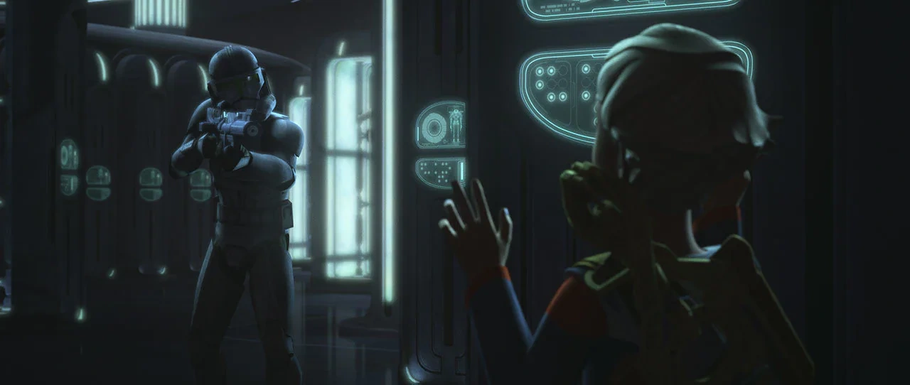Als Hunter den Scharfschützen fragte, wieso sie ihm trauen sollten, gab Crosshair den Befehl an seinen Trupp, die Waffen senken zu lassen. Da sich ES-03 jedoch weigerte, eröffnete Crosshair das Feuer auf kleine Spiegel, die er im Vorfeld in dem Übungsraum platziert hatte und wodurch alle imperialen Truppen mit nur einem Schuss eliminiert wurden. Unterdessen riss AZ-3 heimlich eine weitere Charge mit Trainingsdroiden aus der Wand, welche mit ES-02 zusammenstieß und die Elitesoldatin bewusstlos werden ließ. Omega lobte AZ-3 für dessen Einsatz und versuchte weiterhin, die Trainingsdroiden zu aktivieren.[2]