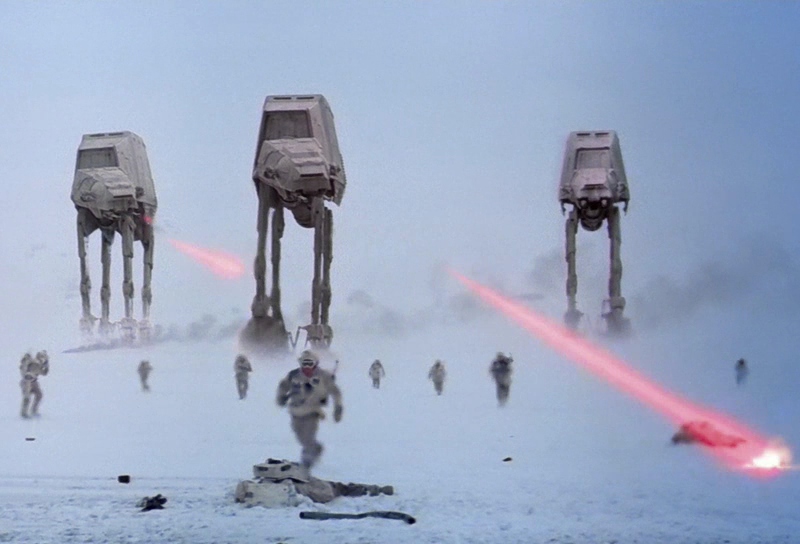 - Die 22,5 Meter hohen AT-ATs waren Modelle, die zwischen 6 und 160 cm groß waren. Ihre Szenen wurden in den Studios von ILM im sonnigen Kalifornien gedreht.