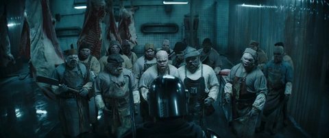 Nachdem er auch Baiz' Körper zerteilt hatte, wollte der Mandalorianer die Schlachterei verlassen und wurde dabei von zahlreichen Metzgern umringt. Aufgrund der Überzahl der Klatooinianer verhielt sich Djarin diplomatisch und bot den Arbeitern an, sie könnten sich an den Credits ihres toten Bosses bereichern, sofern sie ihn ziehen ließen. Die Klatooinianer rannten daraufhin an Djarin vorbei in das Hinterzimmer, um sich das Geld zu schnappen. Djarin selbst schleppte sich daraufhin humpelnd und mit dem Kopf von Baiz in der Tasche aus dem Betrieb zum nächsten Fahrstuhl, der ihn zum Aufenthaltsort seiner Klientin bringen sollte.[1]
