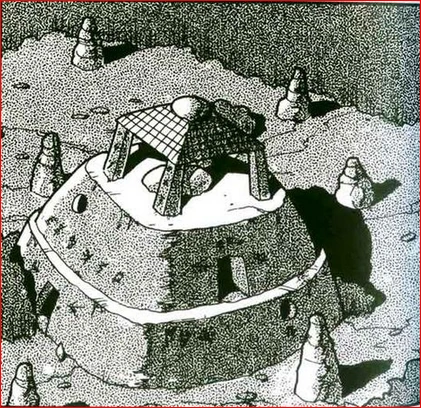Die Schreine hatten eine runde Form und waren aus einheimischem Gestein erbaut, viele von ihnen hatten außerdem eine Kuppel, die häufig von Säulen gestützt wurde. Das Innere war bei jedem dieser Tempel kuppelförmig, mit einem Podest in der Mitte und ein paar Stufen im Umkreis. Die meisten dieser inneren Kammern waren sehr leicht zu erreichen, in manche jedoch konnte man nur durch eine Reihe von Gängen gelangen.[1]