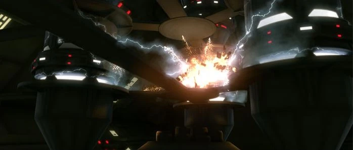 Im Maschinenraum wird er jedoch von CT-1477 aufgehalten, dem er erzählt, er habe sich verlaufen und wäre auf der Suche nach seiner Kompanie. CT-1477 kontaktiert daraufhin einen anderen Klon und beauftragt ihn damit, Boba abzuholen, da die Sicherheitsvorschriften aufgrund der Notfallregelung heraufgesetzt worden sind. Nachdem er Bobas außergewöhnliches Interesse an seiner Waffe bemerkt hat, überreicht er sie ihm, damit er sie sich genauer angucken kann. Jedoch nutzt Boba diese, um ihn niederzuschlagen und zu betäuben, woraufhin er die Waffe auf Feuern umstellt und den Hauptreaktor des Schiffes zerstört. Derweil gehen Anakin, Kilian, Windu und einige Klone den Korridor entlang, als sie die Explosion des Hauptreaktors bemerken, die ein Teil des Schiffes wegbrechen lässt. Die drei werden dadurch beinahe ins Vakuum gezogen, jedoch kann Anakin schließlich die Druckschotts schließen. Er, Windu und einige Klone, die die Explosion überlebt haben, machen sich daraufhin auf den Weg zum Hauptreaktor und stellen dort fest, dass dieser nicht mehr funktionstüchtig ist, wodurch sie gezwungen sind, das Schiff zu verlassen. Während Anakin R2-D2 die Sternjäger startklar machen lässt, befiehlt Kilian Crasher und den Klonkadetten, sich in die Rettungskapseln zu begeben und zum Stützpunkt zurückzukehren.