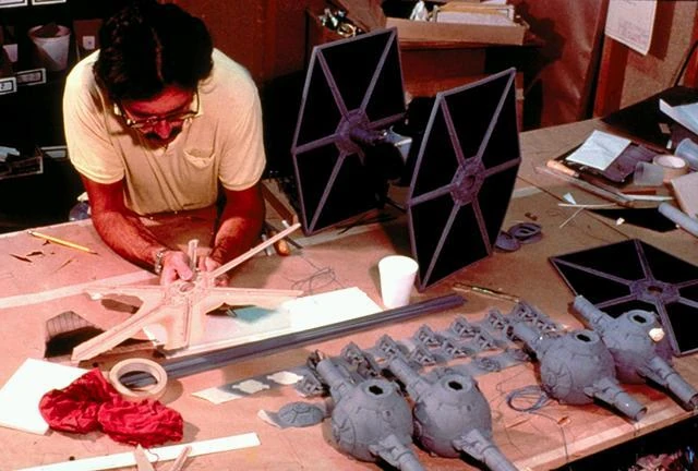 - Letztendlich erstellte man bei ILM sehr detaillierte Zeichnungen und fertigte Blaupausen an, um Modelle des TIE-Jägers zu bauen. Die Arbeiten an den TIE-Jäger, zusammen mit allen anderen Modellen, begannen schließlich 1975, noch bevor das Casting für die Besetzung des Filmes angefangen hatte.