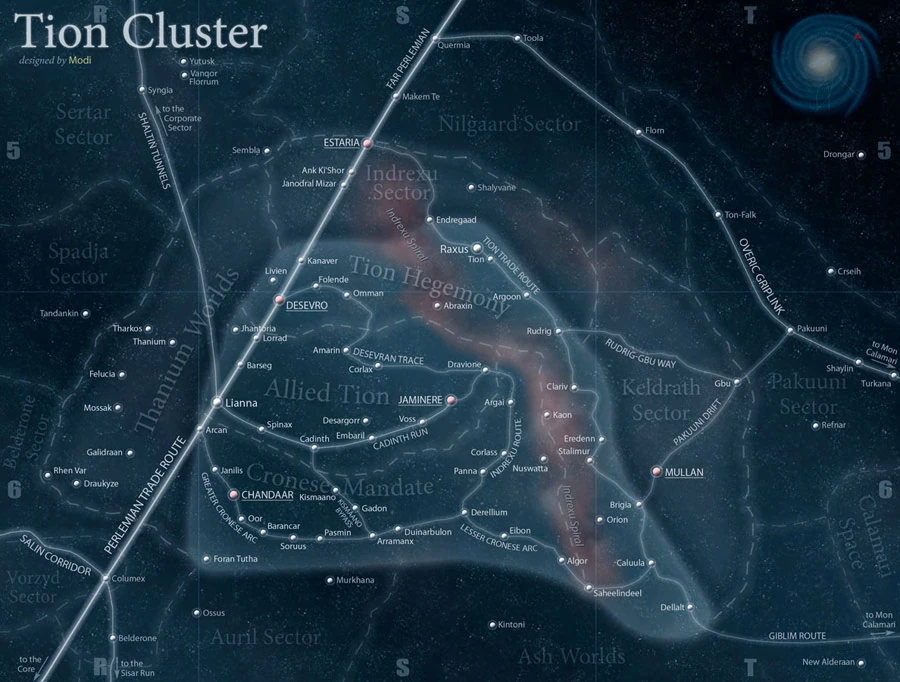 Als Tion-Sternhaufen wird ein Sternhaufen im Äußeren Rand der Galaxis bezeichnet.[1] Das Cronesische Mandat, der Alliierte Tion-Sektor und die Tion-Hegemonie bilden den Kern des Sternhaufens.[2] Auch der Thanium-Sektor, der Indrexu-Sektor und der Keldrath-Sektor sind Teil des Sternhaufens.[1]